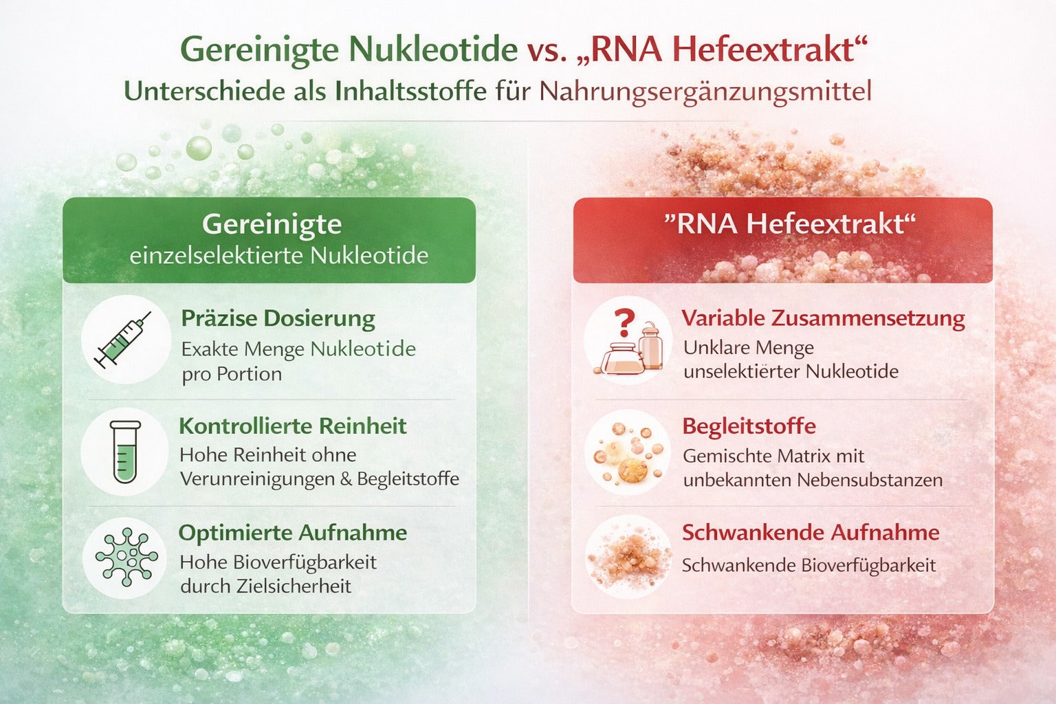Einzelselektierte, gereinigte Nukleotide bieten hier entscheidende Vorteile: Sie ermöglichen eine präzise Dosierung, sind frei von unerwünschten Begleitstoffen und weisen eine deutlich höhere Bioverfügbarkeit auf als unspezifische RNA-Blends oder Hefeextrakte. Dadurch sind sie in vielen Anwendungsbereichen die überlegene und besser kontrollierbare Wahl.