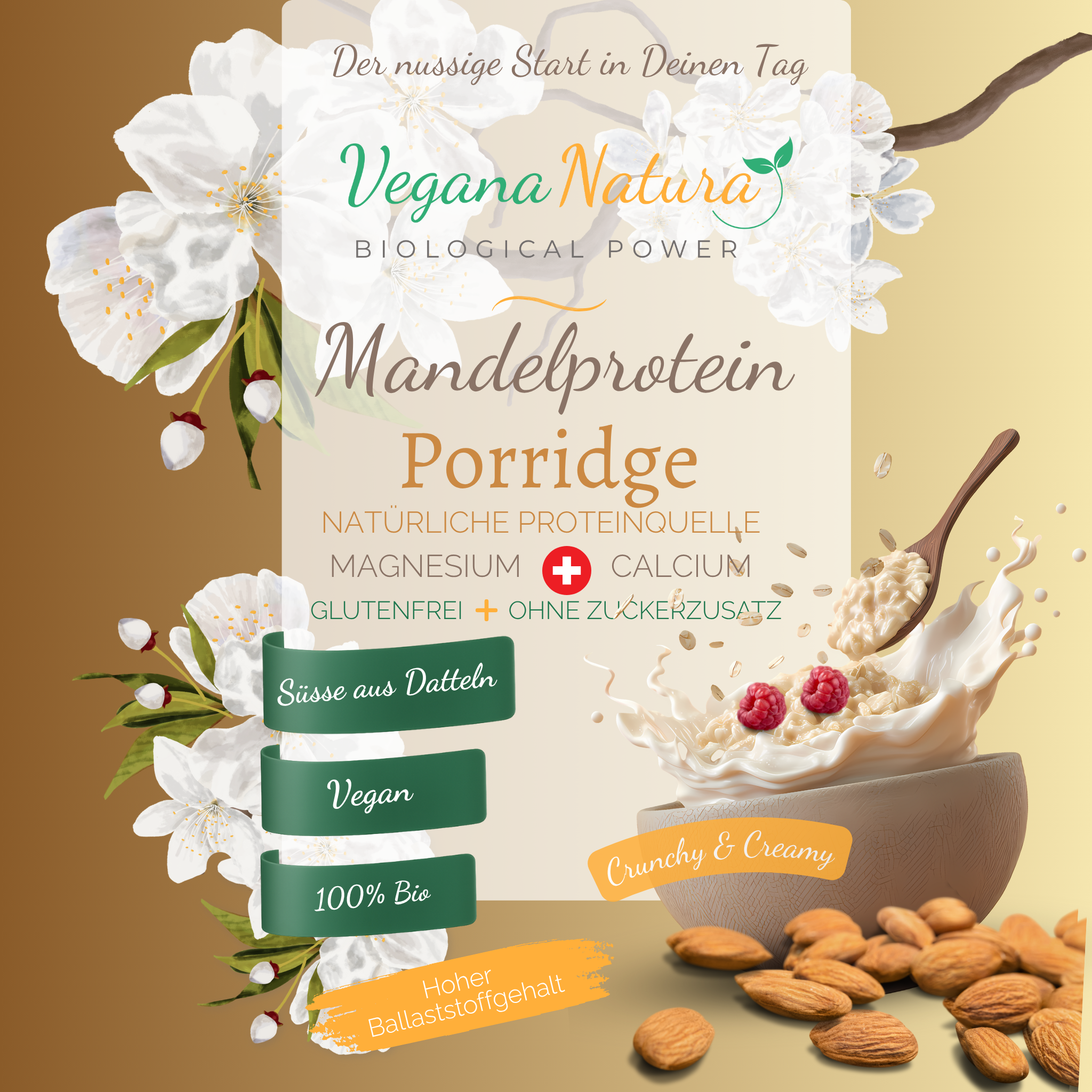 Einfach zubereitet, mega lecker und das mit natürlichen Inhaltsstoffen und kompromisslos in der Qualität. Ob als gesunder Snack zwischendurch oder als nährstoffreiches Frühstück - das MandelProtein PORRIDGE von Vegana Natura liefert Dir das Wichtigste in einer einfach und schnell zubereiteten Form. Dein gesunder Snack für ein langanhaltendes Sättigungsgefühl mit viel Energie für deinen Tag.
